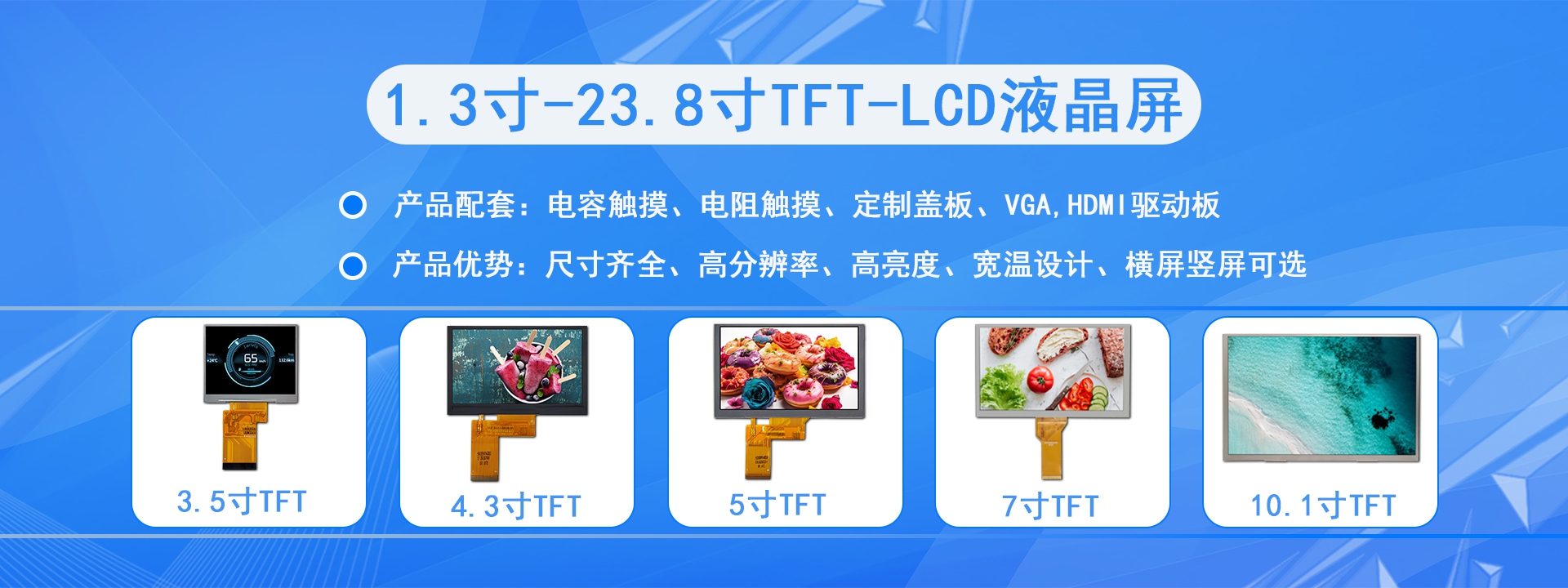 品類齊全( 0.96~27寸常規(guī)屏、條形屏、方形屏、圓形屏、半反半透屏) 常備庫存(常規(guī)尺寸1~5k安全庫存) 支持小單( 常規(guī)尺寸1pcs起訂)